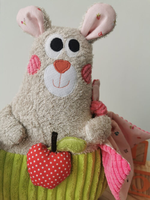 Votre bébé sera heureux de retrouver à l’heure de la sieste ce copain tendre, moelleux et câlin. Il s’amusera à lui attraper les oreilles ou grattouiller ses joues. Petit plus, sa couverture est amovible et peut être lavée séparément, ainsi bébé trouvera toujours l’odeur apaisante et familière de son doudou.