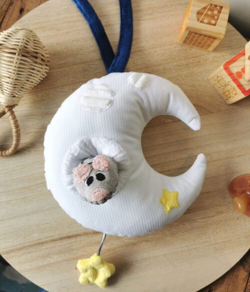 Une jolie Lune en croissant pour endormir bébé, il sera surprise de découvrir qu’une petite souris y habite et la grignote ! Quand cette souris malicieuse sort de son trou, une douce musique se fait entendre, une mélodie qui endort les bébés…